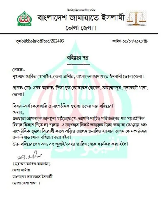 তবে ভোলা জেলা জামায়াত জানিয়েছে, ওমর ফারুকসহ যোগদানকারীদের সঙ্গে জামায়াতে ইসলামের কোনো সম্পর্ক নেই।