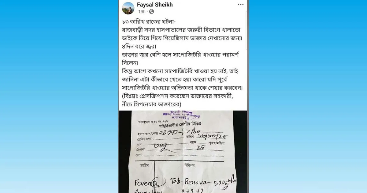 বুধবার (১৫ অক্টোবর) দুপুরে ফয়সাল শেখ নামের এক ব্যক্তি তার প্রোফাইল ও ‘উই আর রাজবাড়ীয়ানস’ ফেসবুক গ্রুপে ছবি পোস্ট করে লেখেন— “জ্বর বেশি হলে ডাক্তার সাপোজিটরি খাওয়ার পরামর্শ দিলেন। আগে কখনো খাওয়া হয়নি, কেউ জানালে উপকার হয়।” পোস্টটি দেখেই অনেকে হাস্যরসাত্মক মন্তব্য করেন, কেউ কেউ আবার স্বাস্থ্যসেবার মান নিয়ে উদ্বেগ জানান।