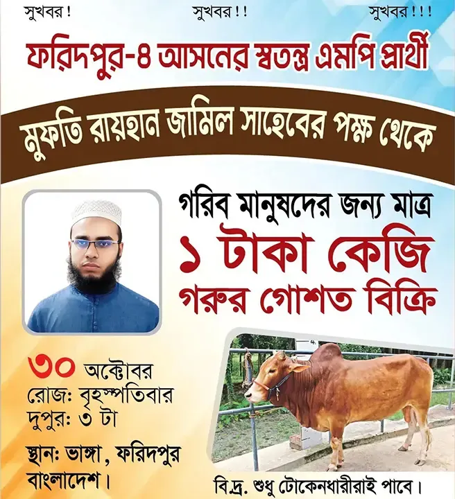 ফরিদপুর-৪ (ভাঙ্গা-সদরপুর-চরভদ্রাসন) আসনের স্বতন্ত্র সংসদ সদস্য প্রার্থী রায়হান জামিল আবারও আলোচনায়। এবার তিনি মাত্র ১ টাকায় গরুর মাংস বিতরণের ঘোষণা দিয়েছেন। এর আগে ১০ টাকায় ইলিশ বিক্রি করে দেশজুড়ে আলোচনায় আসেন তিনি।