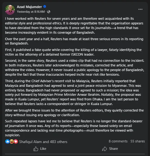 স্ট্যাটাসে তিনি উল্লেখ করেন, রয়টার্সে সাত বছর কাজ করার অভিজ্ঞতা থেকে তিনি সংস্থাটির সম্পাদকীয় নীতি ও পেশাদার মানদণ্ড সম্পর্কে ভালোভাবেই জানেন। কিন্তু সাম্প্রতিক বছরগুলোতে বাংলাদেশ নিয়ে তাদের একাধিক প্রতিবেদনে তথ্যভিত্তিক ভুল ও দায়িত্বহীনতা স্পষ্টভাবে প্রকাশ পেয়েছে।